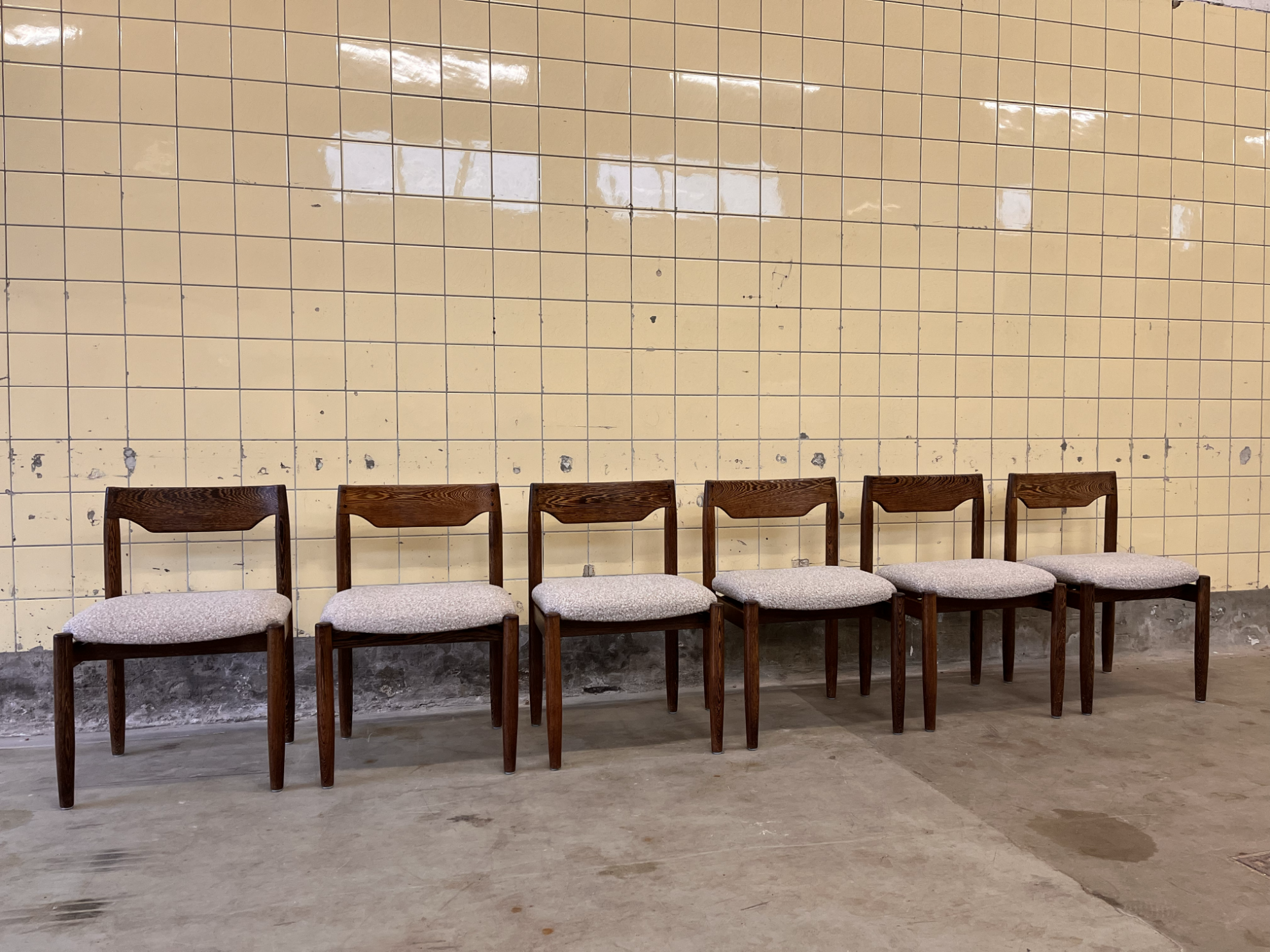 Set of six Scandinavian Wengé dining chairs – Elegant & comfortableThis set of six Scandinavian dining chairs is crafted in rich wengé wood and features beautifully upholstered seats in a soft sand-colored bouclé. The contrast between the dark wood and the light, textured fabric creates a refined and timeless look. The chairs are in a nice, stable condition, offering both comfort and durability for everyday use.