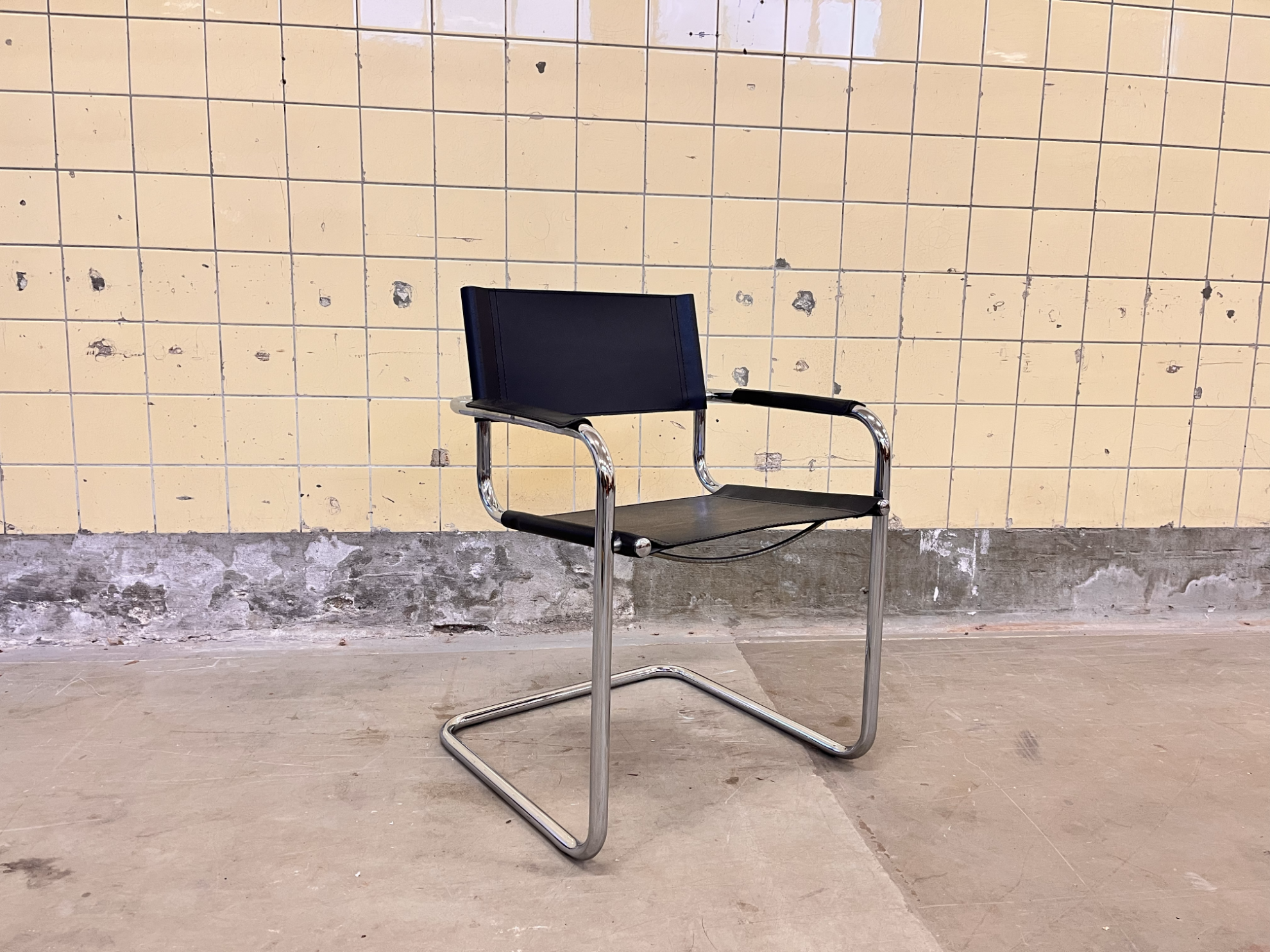 Tubular steel chair – Bauhaus style & IconicThis tubular steel chair features a black skai seat and backrest and is designed in the spirit of Marcel Breuer’s Bauhaus aesthetic. The clean lines and cantilevered form give the chair a light yet architectural presence. It remains in a beautiful and stable condition, with only light oxidation on the frame that adds to its authentic vintage character. The seat and backrest are intact and show no tears.