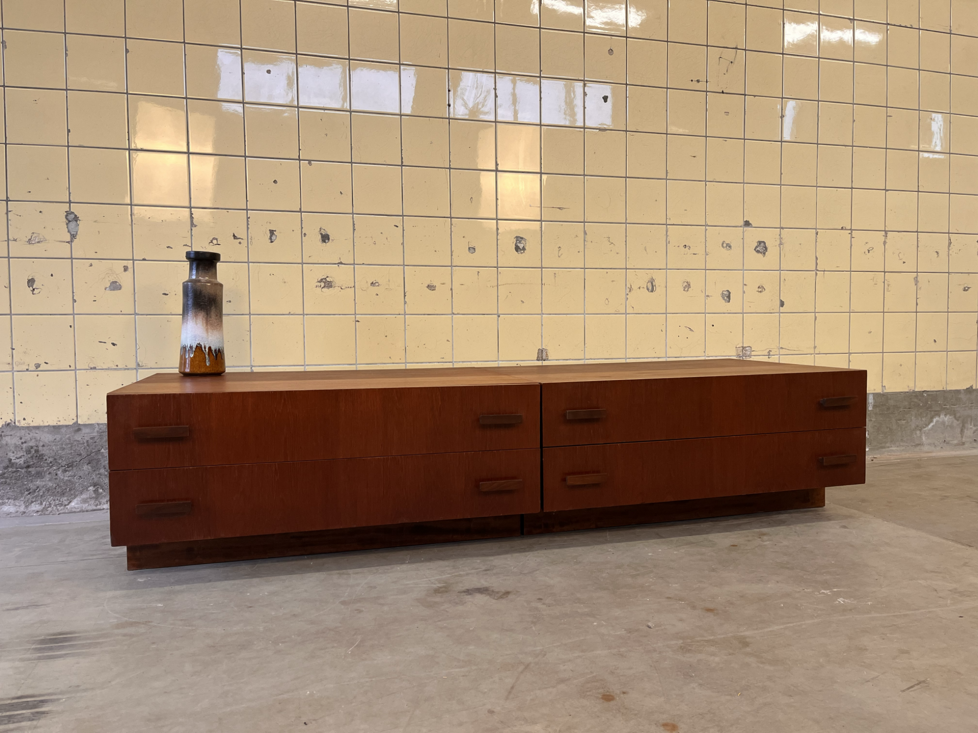 Pair of Teak cabinets – Modular & versatileThis pair of teak cabinets can be used together as a TV unit or lowboard, offering a flexible and well-balanced setup. Both pieces feature solid wooden handles that highlight the quality and craftsmanship of the design. They are in beautiful vintage condition with only minimal signs of use. One module shows a few light marks on the top surface; these are subtle and hardly noticeable once the cabinet is in use.