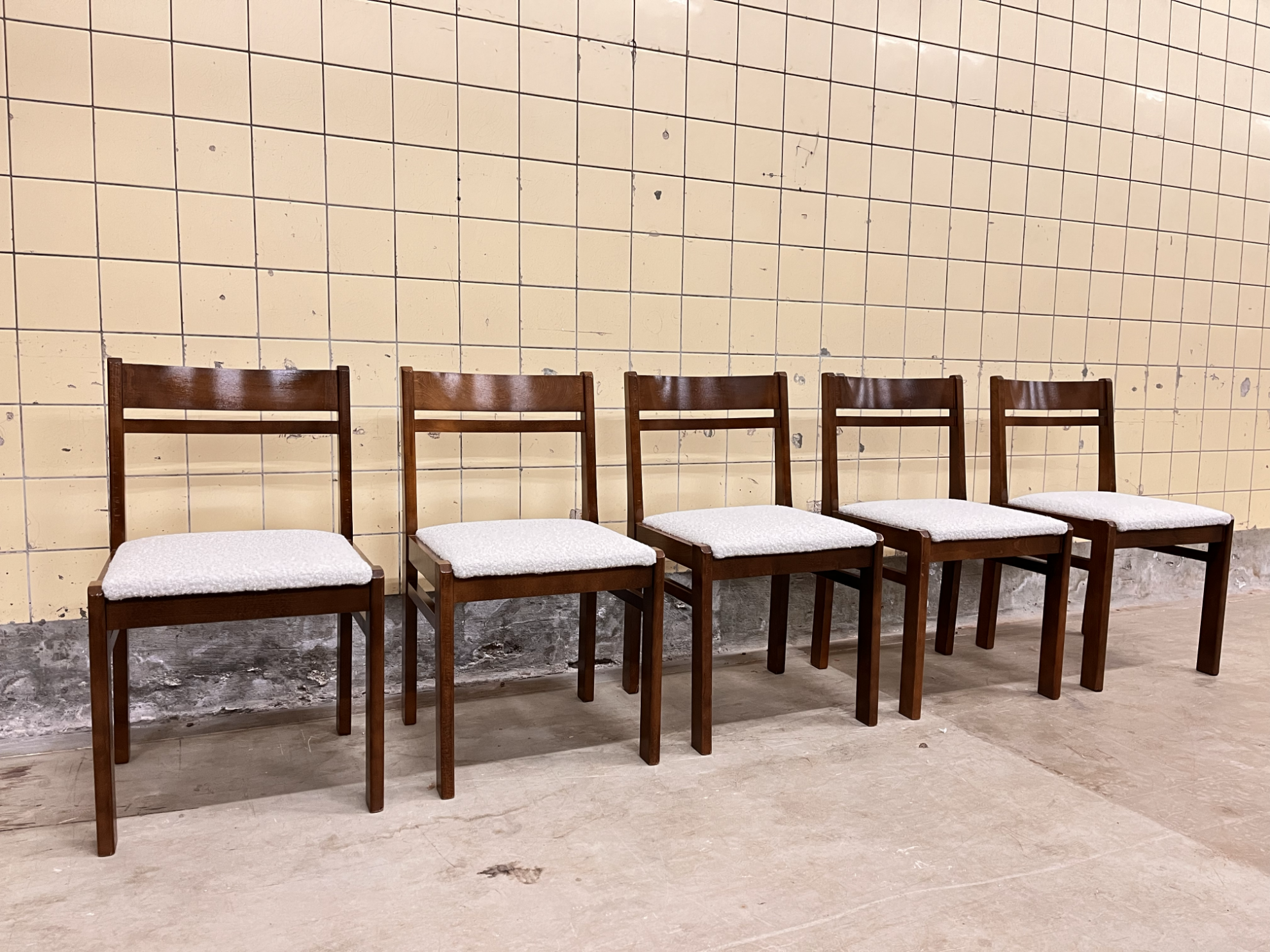 Set of five Belgian wooden dining chairs – Elegant & newly upholsteredThis set of five Belgian vintage dining chairs is crafted in warm wood, featuring the refined, elegant lines typical of mid-century design. All chairs have been newly reupholstered in a soft white bouclé fabric, adding a fresh and inviting texture that pairs beautifully with the wooden frame. The construction is solid and reliable, ensuring that each chair remains very sturdy and comfortable for everyday use.