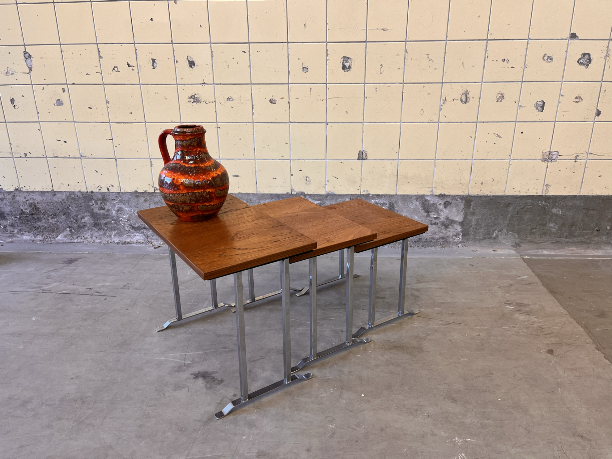 Set of three nesting side tables – Compact & practicalThis set of three side tables is finished in warm teak veneer and features a sleek chrome frame that adds a subtle modern contrast. Designed to nest neatly under one another, the tables offer flexible use while remaining compact when not needed. Their clean lines and practical design make them easy to move and adapt to different spaces.