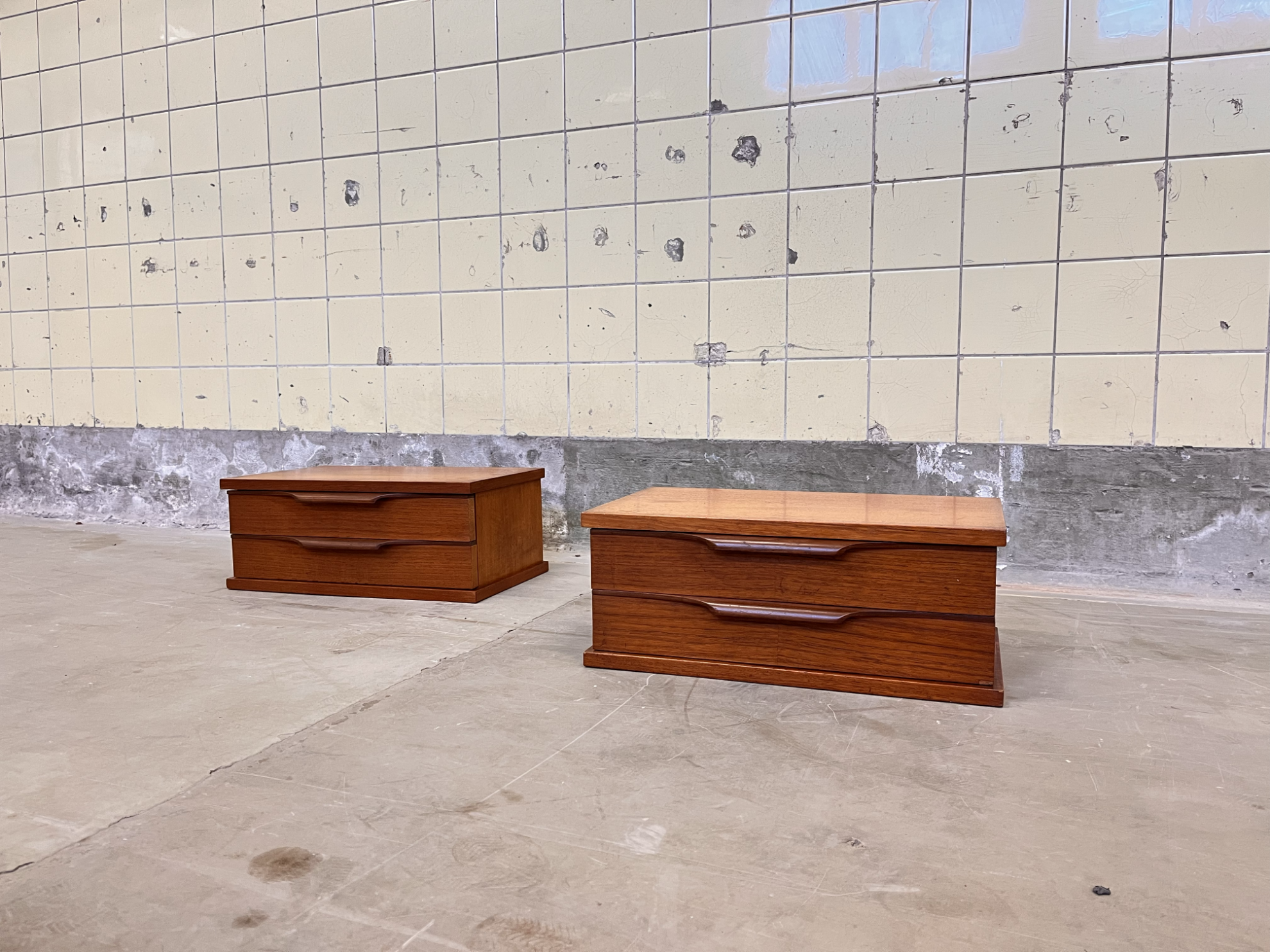 Set of two Belgian floating nightstands – Elegant & practicalThis set of two Belgian floating nightstands in teak veneer showcases refined craftsmanship and a beautifully clean design. Each piece features solid wood handles and two smoothly running drawers, offering practical storage while maintaining an airy, minimalist look. Their wall-mounted construction creates a floating effect, making them perfect for modern interiors where lightness and simplicity are key.